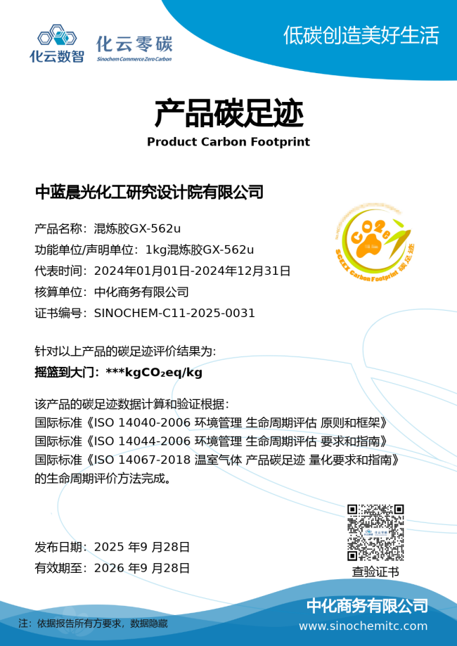 克日,,由9888拉斯维加斯(以下简称“9888拉斯维加斯商务”)提供碳足迹治理服务的中蓝晨光院GX-562u混炼胶产品,,顺遂通过国际权威认证机构SGS的严酷评估,,获得产品碳足迹证书。。。。。。此次认证的通过,,标记着9888拉斯维加斯商务在绿色低碳咨询领域再添主要效果,,为工业单位绿色转型与国际市场拓展提供坚实支持。。。。。。